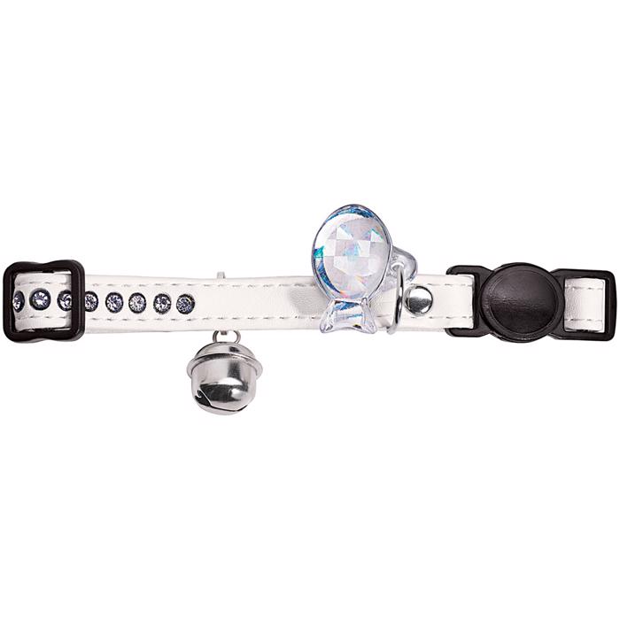 Katte halsbåndet har også en sød lille klokke og en hvid skinnende fisk, hvor på du kan skrive kattens navn, samt dit telefonnummer. Halsbåndet her har en sikkerhedslås, som åbner sig, hvis der trækkes kraftigt i halsbåndet. Det er en sikkerhed for dig, så du ved din kat ikke kan komme til skade med halsbåndet på.