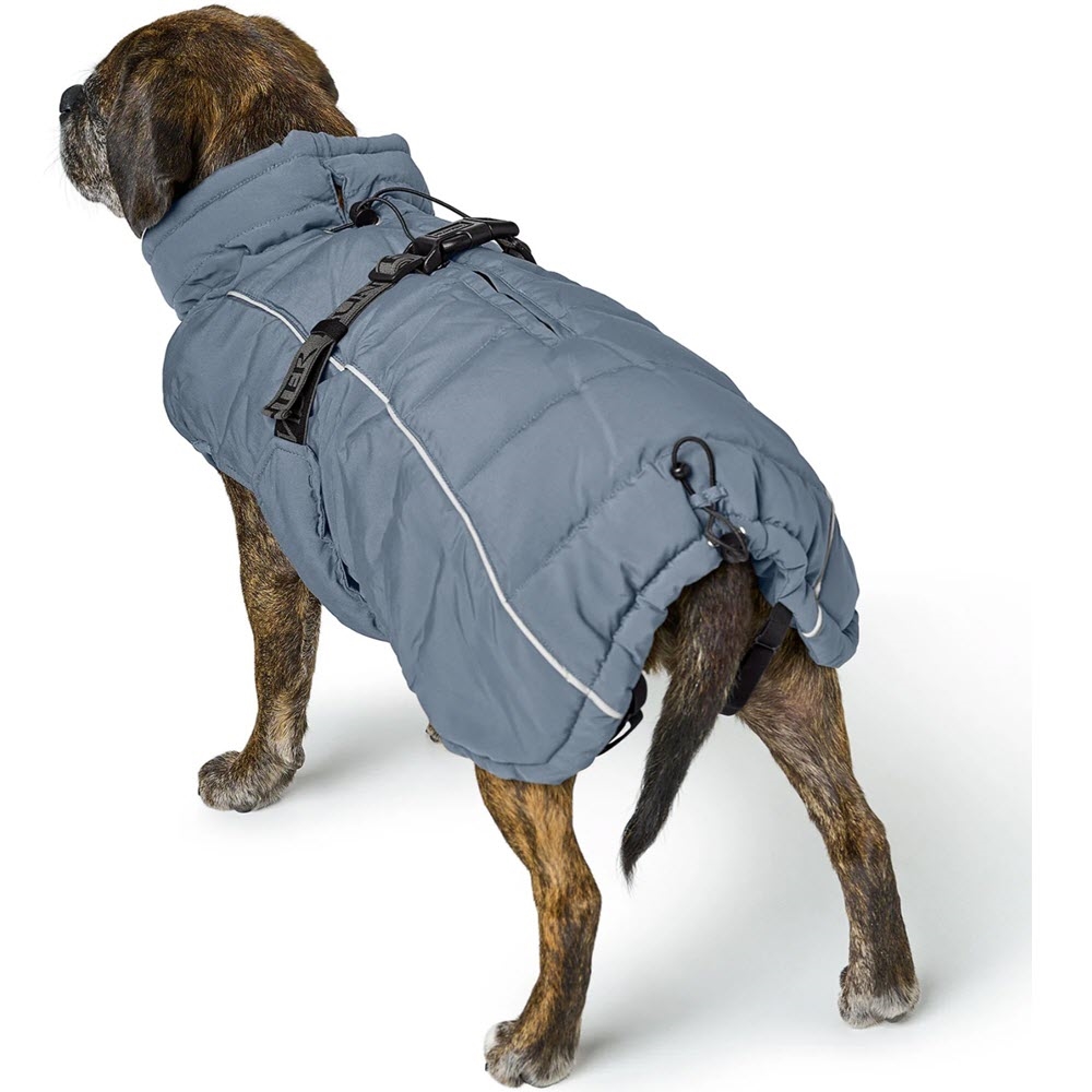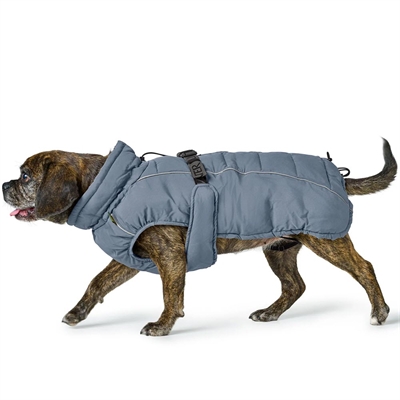 Denne super smarte polstrede jakke er designet til at kunne passe de mindre bulldog racer. Jakken har et elastisk mavebælte, der nemt og ligetil justeres og klikkes rundt om hundens mave.