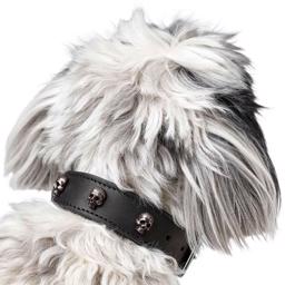 Smart læderhalsbånd til hunden med små flabede kranier på. Vælg mellem 6 størrelser.