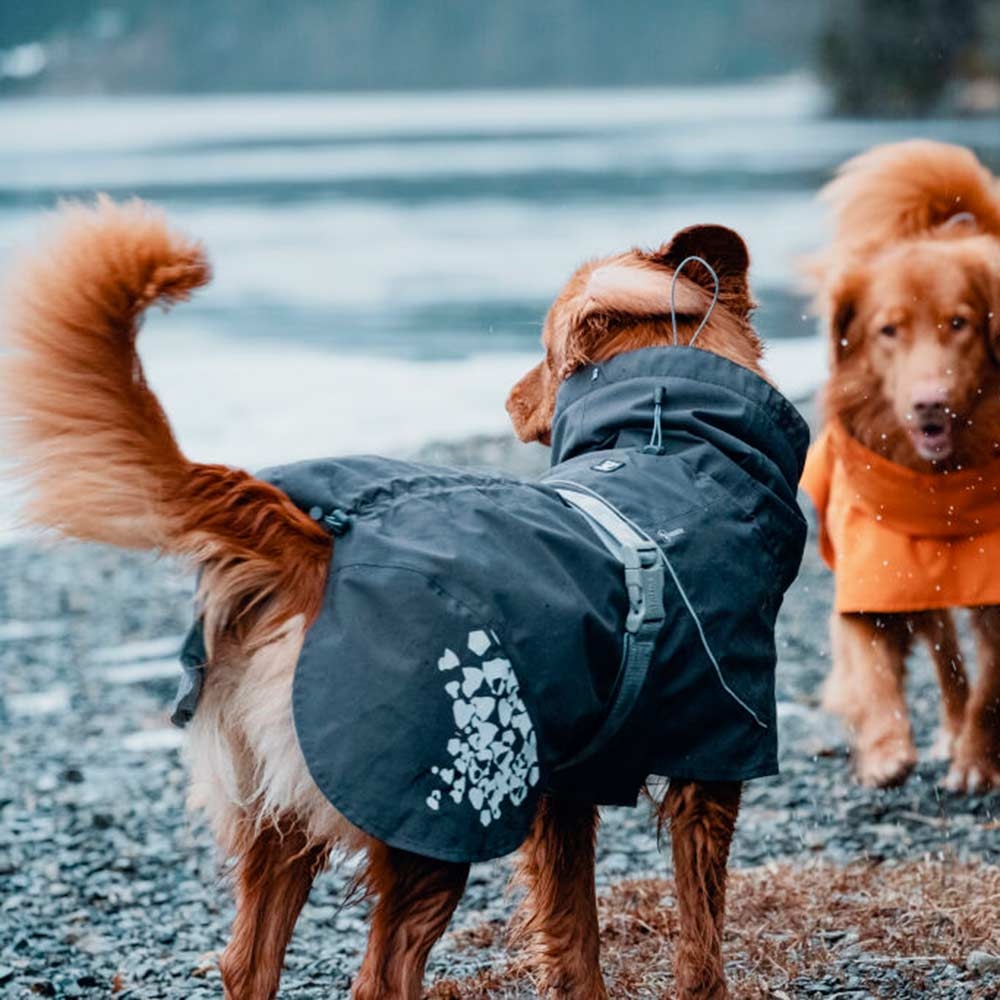 Har du en hund du gerne vil holde tør og forholdsvis ren, på jeres gåtur i regn, slud, blæsevejr og mudder? Så har Hurtta designet denne nye og utrolig funktionelle regnjakke. Den grå krave, som du kan se på billederne, kan trækkes helt sammen med en elastiksnor, så vandet ikke trænger ind under jakken. Den behagelige bløde krave kan strammes op omkring hundens hals, for at beskytte bryst og nakkeområdet.
