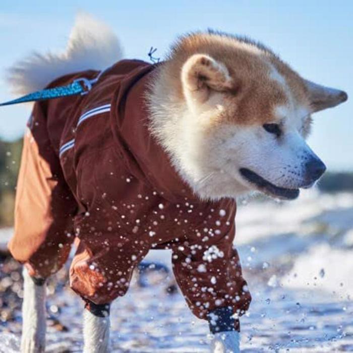 Heldragten er vandtæt og der er åbning i ryggen til at hunden kan have sele inden under.