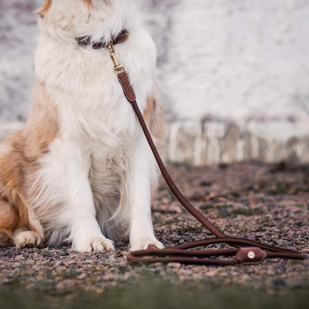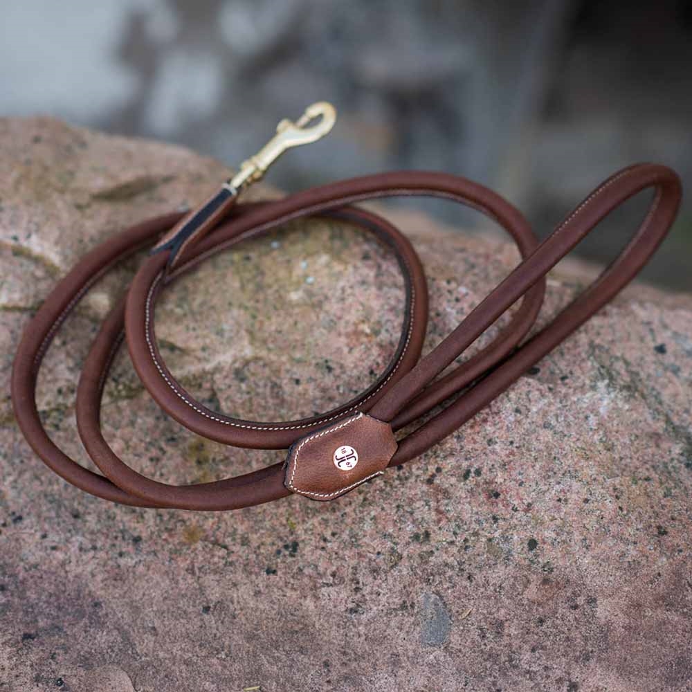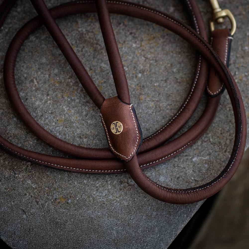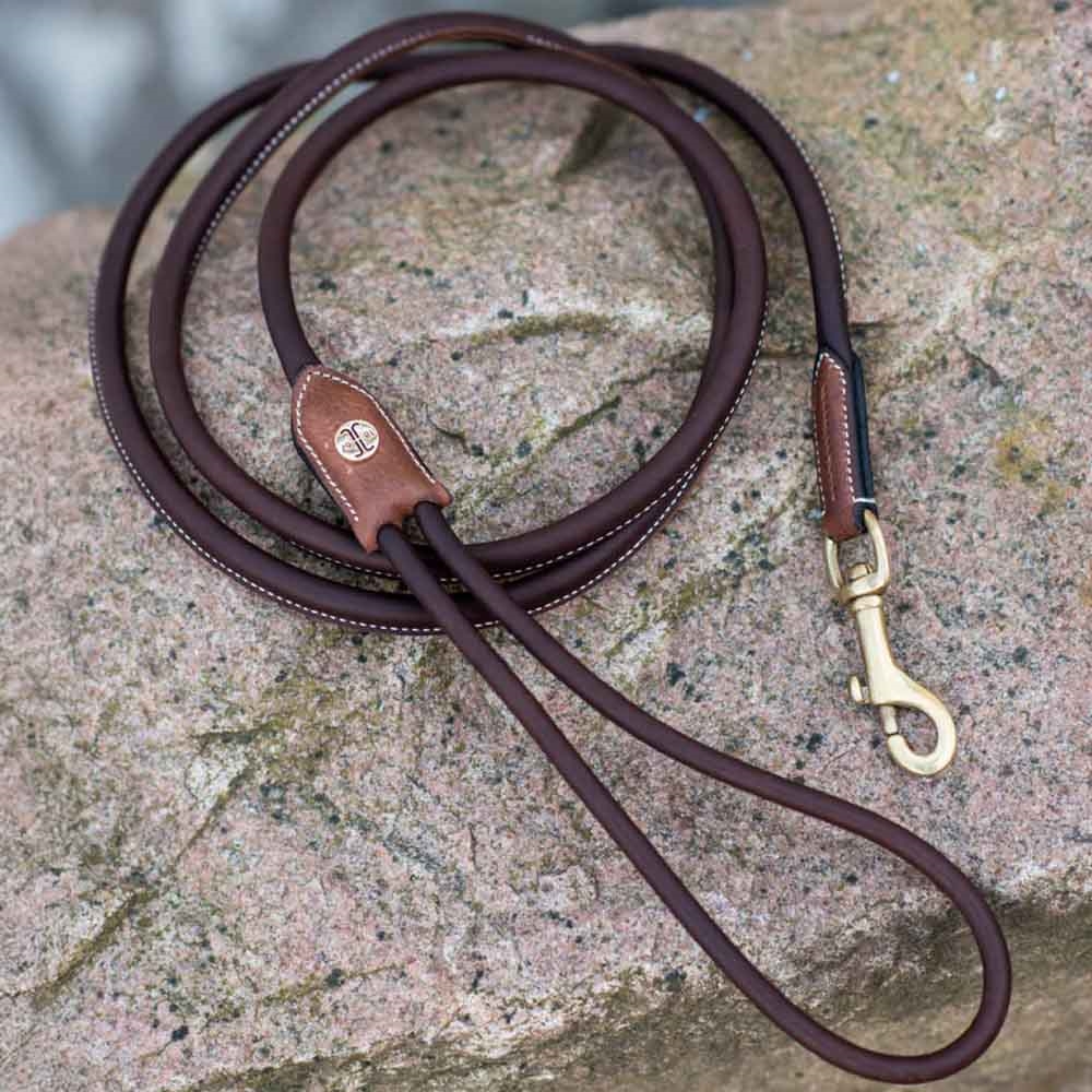 Denne flotte brune læderline ligger let og lækkert i hånden. Linen er designet med flot messing karabinhage og har et håndtag i enden.