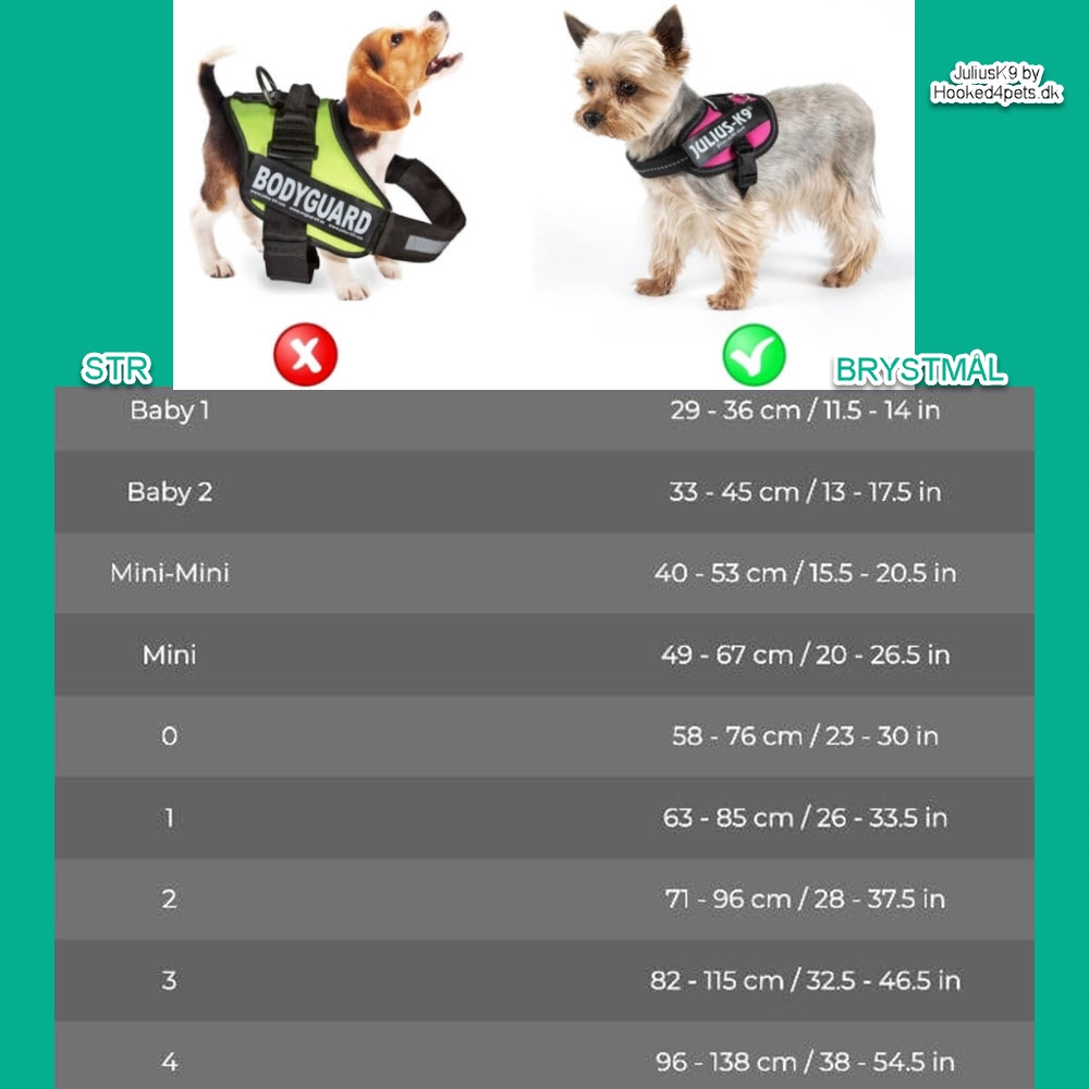 • Mini - Brystmål imellem 49-67 cm - Hundens vægt 7-15 kg
