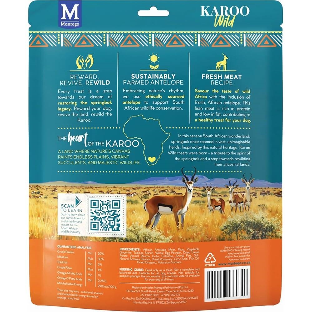 Karoo Wild hundegodbidder er lavet af antilopekød fra Afrika. En godbid som har et lavt fedtindhold og et højt protein indhold samt en karakteristisk vildtsmag, som er uimodståelig for hunde.