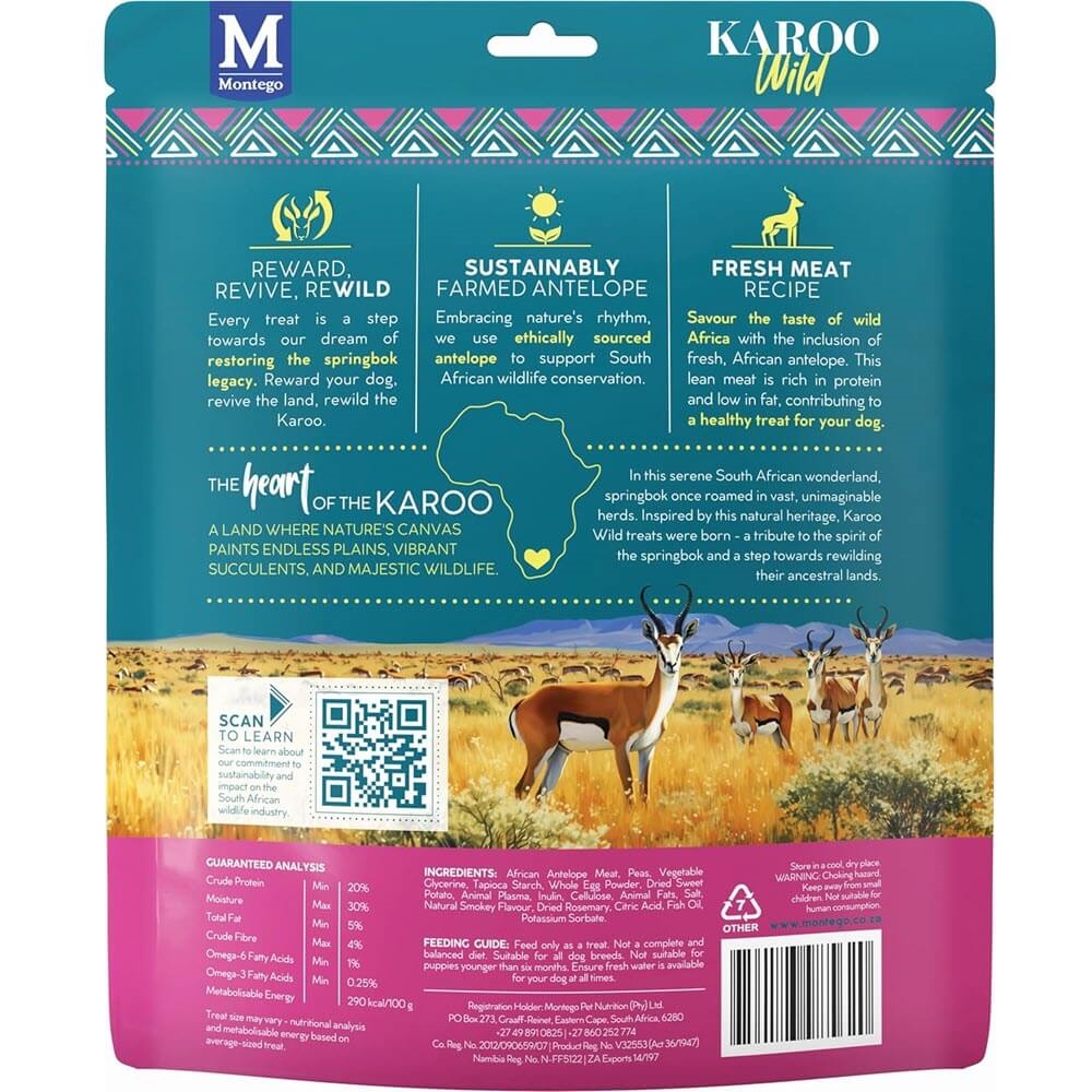 Karoo Wild hundegodbidder er lavet af antilopekød fra Afrika. En godbid som har et lavt fedtindhold og et højt protein indhold samt en karakteristisk vildtsmag, som er uimodståelig for hunde.