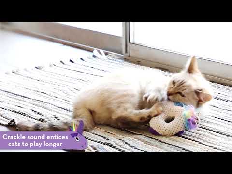 Legetøj til den forkælede kat. Her får du en blød bamse fyldt med katteurt, som skal forestille en enhjørning.