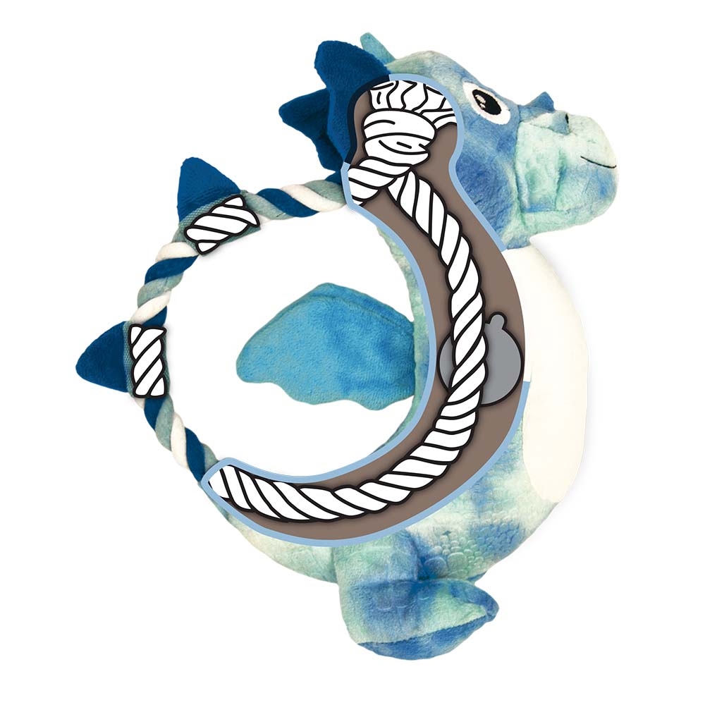 Denne skønne KONG bamse skal forestille sig at være en drage. På ydersiden er den en sød og blød plys-figur, og indvendigt er den designet med et stærkt og holdbart reb med knuder.