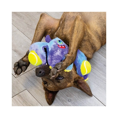 Kong Company Woozles Monster. Hundelegetøj med plys og bolde. Denne variant er blå, lilla mix