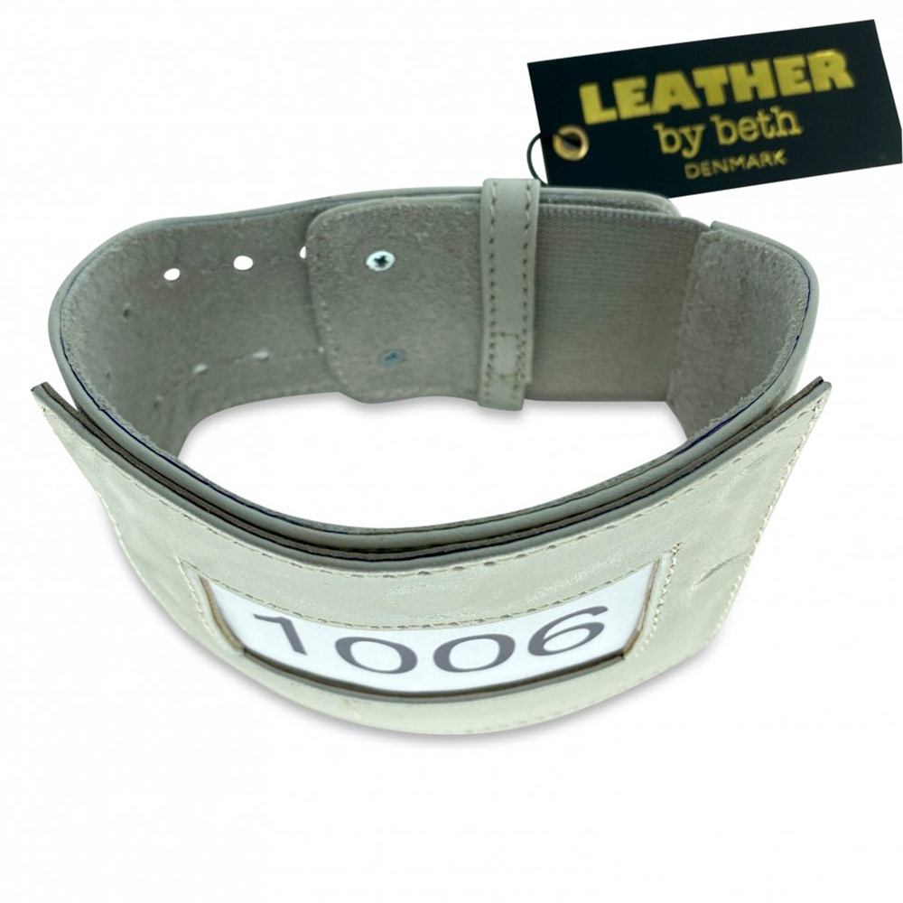 En nummerholder til armen som kan bruges til hundeudstilling, ridning, shows eller andet. Denne model er i off-white læder.