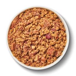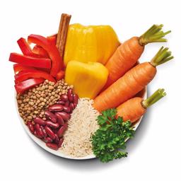 Sammensætning: Jackfrugt (10%), ris, ærteprotein, gulerødder, linser, rød peber (4%), kidneybønner (2%), solsikkeolie, gær, mineraler, tomatpulver, linolie, kanel, persille, alger