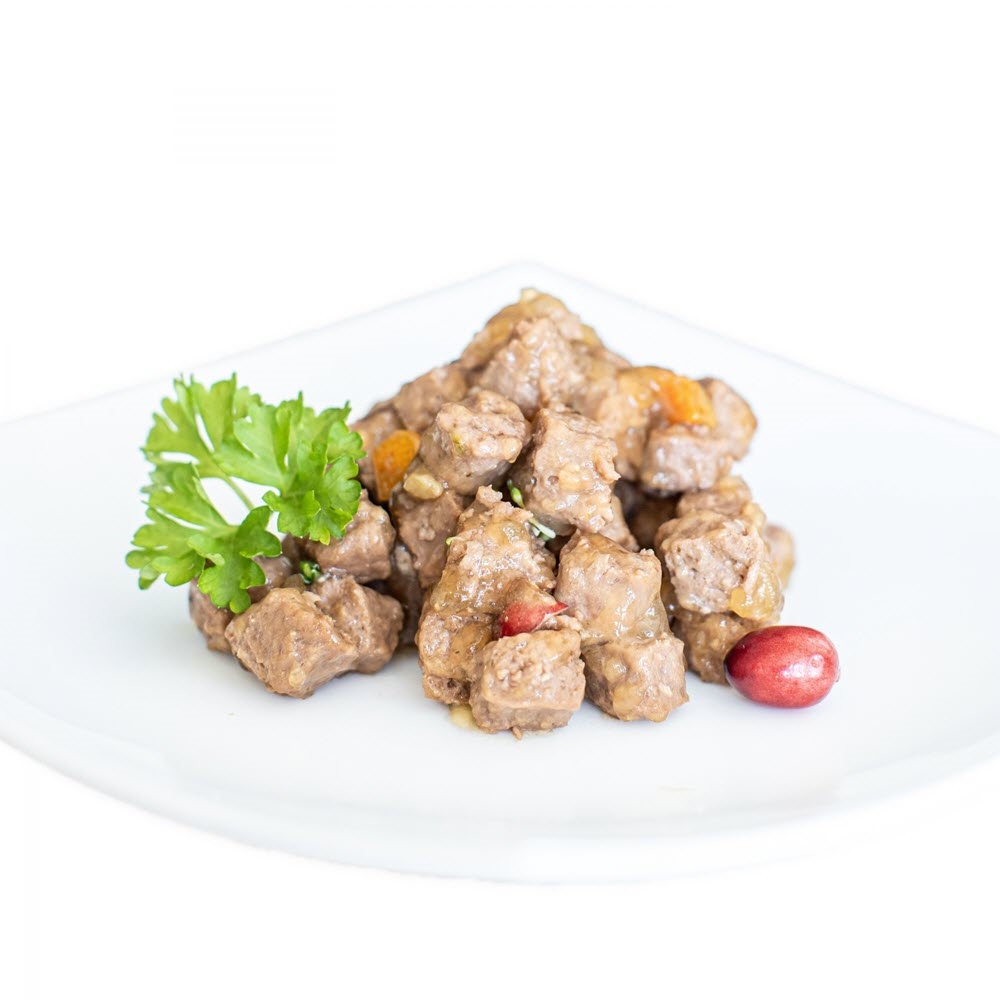 Vådfoder i urtesovs. Fyldt med kalkun, broccoli, gulerødder og tranebær. 390 gram mums
