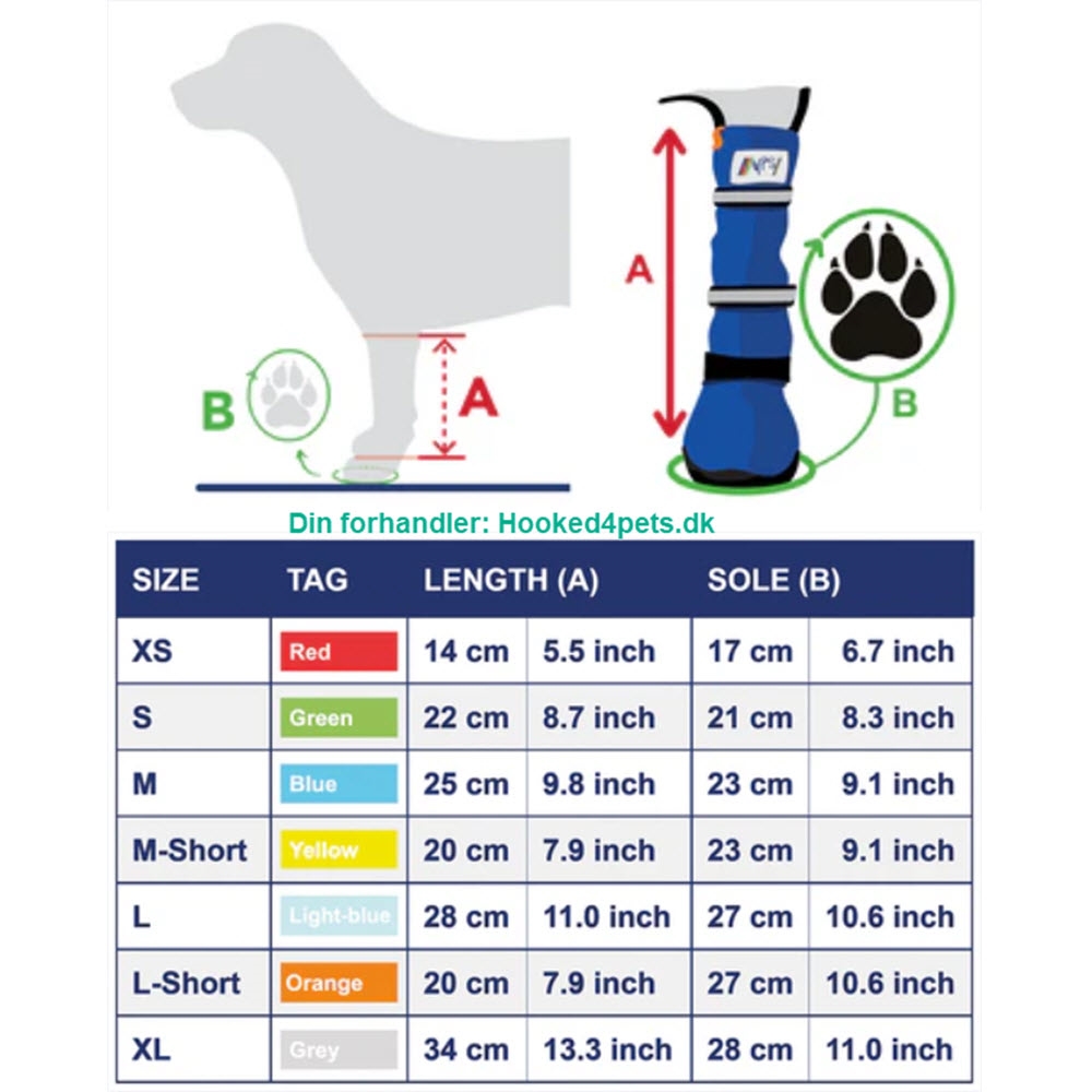 Hvis din hund er et sted mellem to størrelser, anbefaler vi at vælge den mindre størrelse. MPS-Medical PetS Boot® fås i 7 størrelser. Størrelse M og L fås i en lang og en kort version. Hver størrelse er let at genkende på sin egen farvekode. Kontakt os hvis du ønsker hjælp
