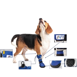 MPS-Medical PetS Boot® har en slidstærk, fleksibel, skridsikker gummisål. For- og bagsiden af ​​gummisålen er lidt højere for mere beskyttelse, hvis hunden slæber med poten. På grund af den brede åbning er MPS-Medical PetS Boot® også meget velegnet til hunde, der bruger gips. Den øverste snor kan lukkes for at holde regnen ude. Velcro®-stropperne holder støvlen på plads.