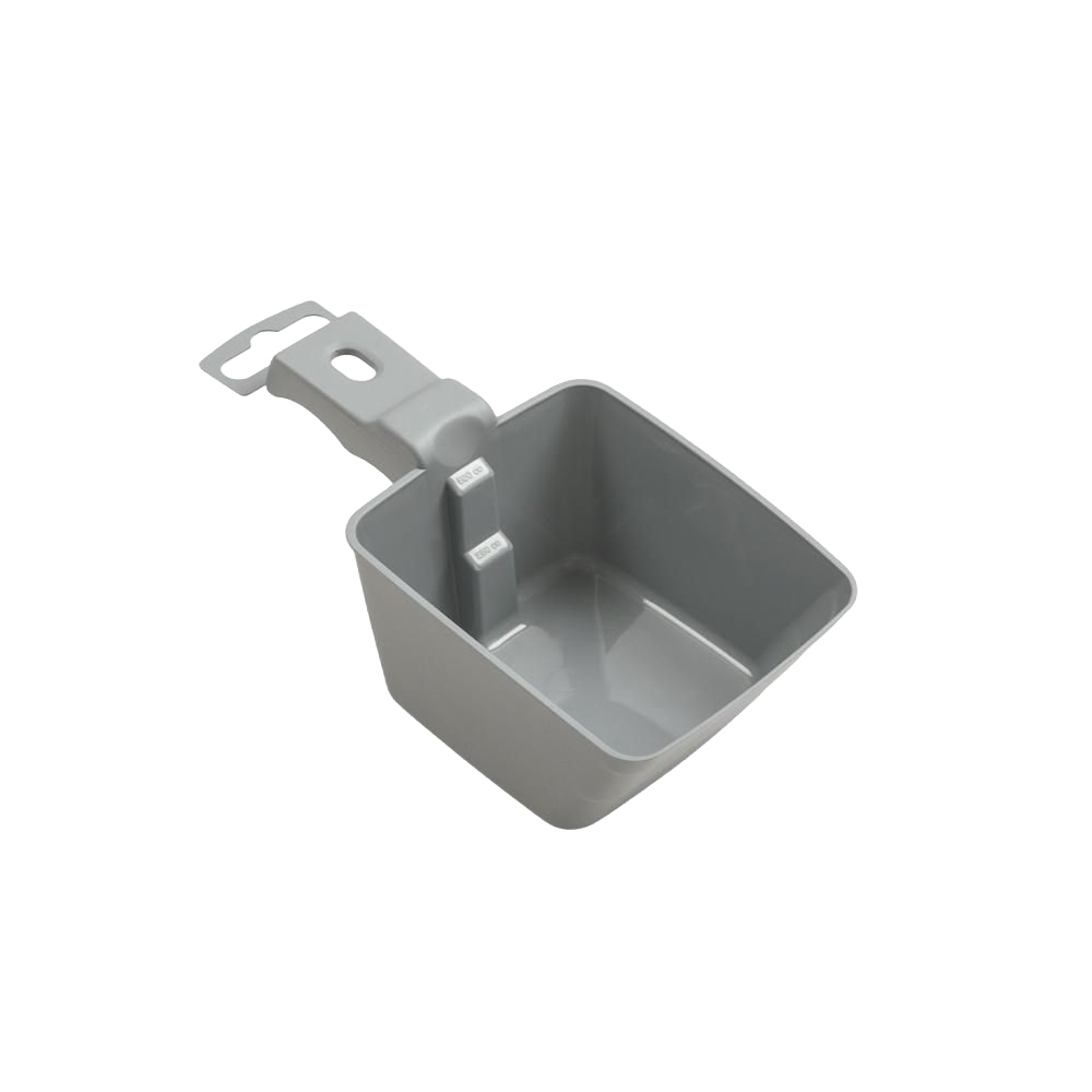 Den integrerede foderskovl gør det nemt at dosere foderet direkte fra containeren, uden spild og uden at skulle lede efter ekstra redskaber.