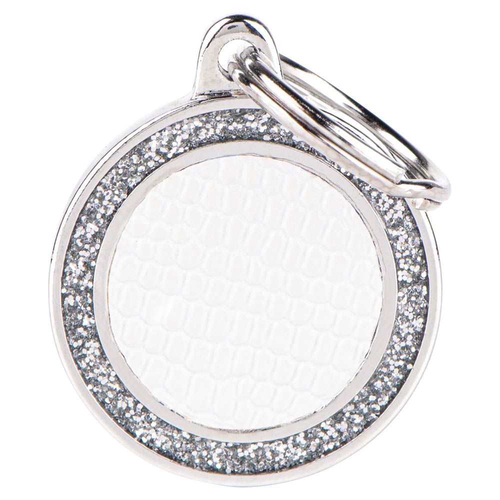 Hundetegn i aluminium som er cirkelformet. Dette hundetegn er hvidt med glimmer.