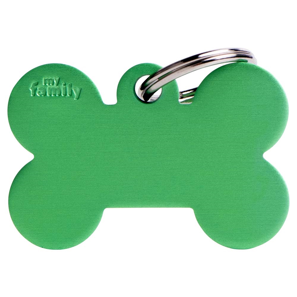 Hundetegn i metal, formet som et kødben. Dette hundetegn er grønt og findes i 3 størrelser.