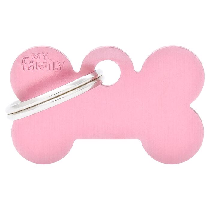 Hundetegn i metal, formet som et kødben. Dette hundetegn er pink og findes i 3 størrelser.