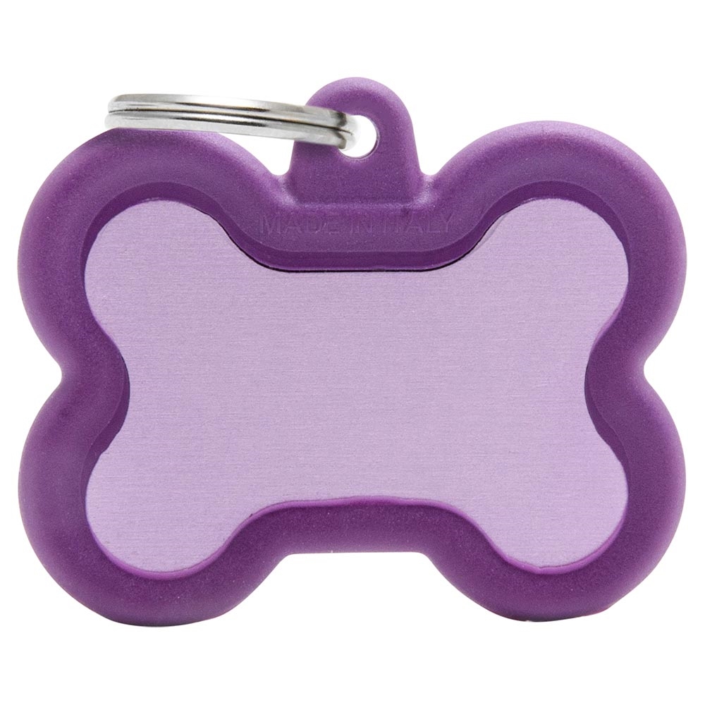 Her får du et kvalitets hundetegn i metal fra MyFamily, som er designet med en gummikant, som gør tegnet mere lydløst, når det hænger i hundens halsbånd og dingler. Metalet og gummiet er sammensmeltet, så det ikke larmer, samt så det holder bedre.