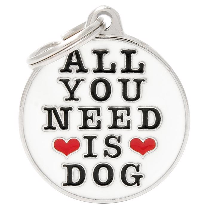 Hundetegnet består af en hvid cirkel med teksten "All you need is dog". Tegnet er inklusiv gravering.