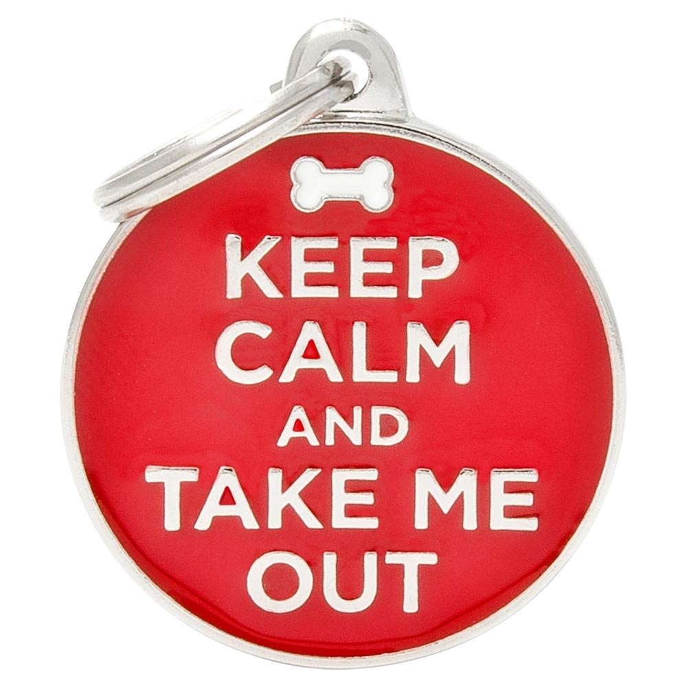 Her får du et kvalitets hundetegn i metal fra MyFamily, som er designet som en blå cirkel med følgende tekst "Keep calm and take me out". Hundetegnet graveres direkte hos os, når du bestiller. Så dette tegn er inklusiv dit valg af gravering. Der følger en lille nøglering med til tegnet.