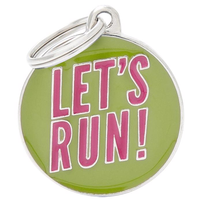 Her får du et kvalitets hundetegn i metal fra MyFamily, som er designet som en grøn cirkel med teksten "Let's Run!". Hundetegnet graveres direkte hos os, når du bestiller. Så dette tegn er inklusiv dit valg af gravering. Der følger en lille nøglering med til tegnet.