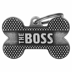 Hundetegn i aluminium som er formet som et kødben. Dette hundetegn har teksten "The Boss".