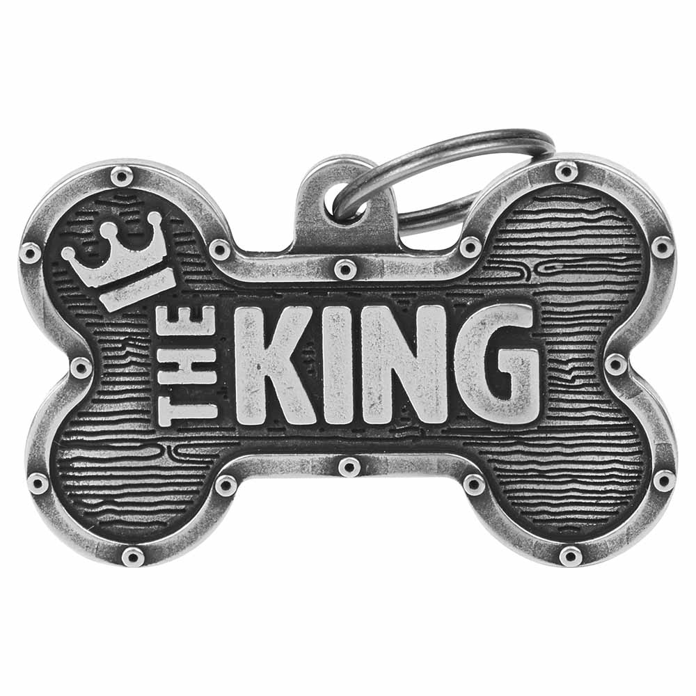 Hundetegn i aluminium som er formet som et kødben. Dette hundetegn har teksten "The King".