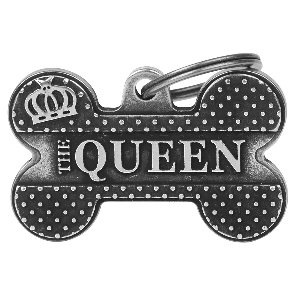Hundetegn i aluminium som er formet som et kødben. Dette hundetegn har teksten "The Queen".