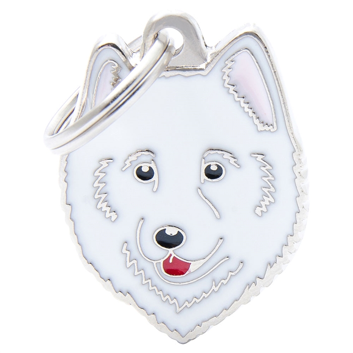 Her får du et kvalitets hundetegn i metal fra MyFamily, som er designet som racehunden Samojed.