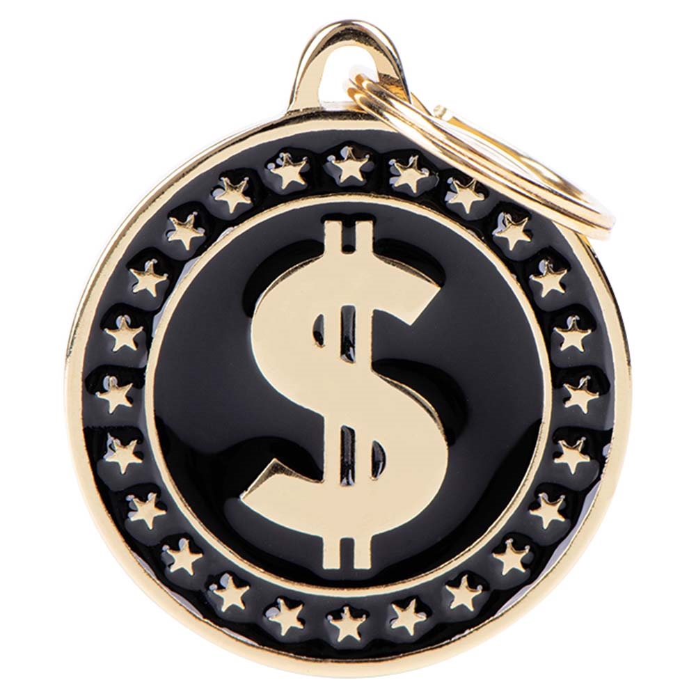 Her får du et kvalitets hundetegn i metal fra MyFamily. Et rundt hundetegn i sort med guldkant og guldfarvet dollartegn.