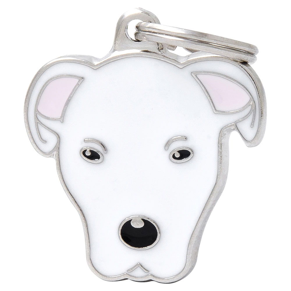 Her får du et kvalitets hundetegn i metal fra MyFamily, som er designet som racen Argentinsk Mastiff, også kaldet Dogo Argentino.