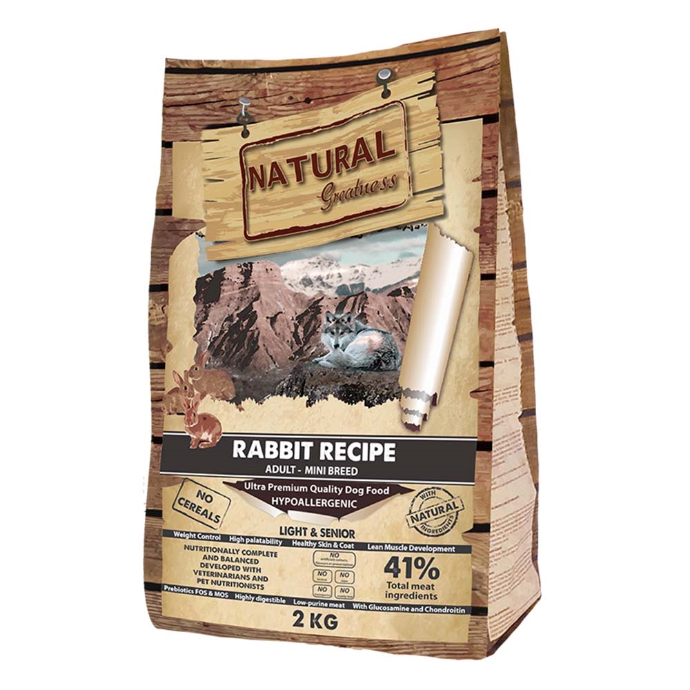 Natural Greatness RABBIT RECIPE MINI er en fremragende ultra-premium, monoprotein og hypoallergen opskrift formuleret uden korn og ideelt udviklet til voksne hunde, steriliserede voksne hunde eller seniorer af små og mellemstore racer med tendens til overvægt.