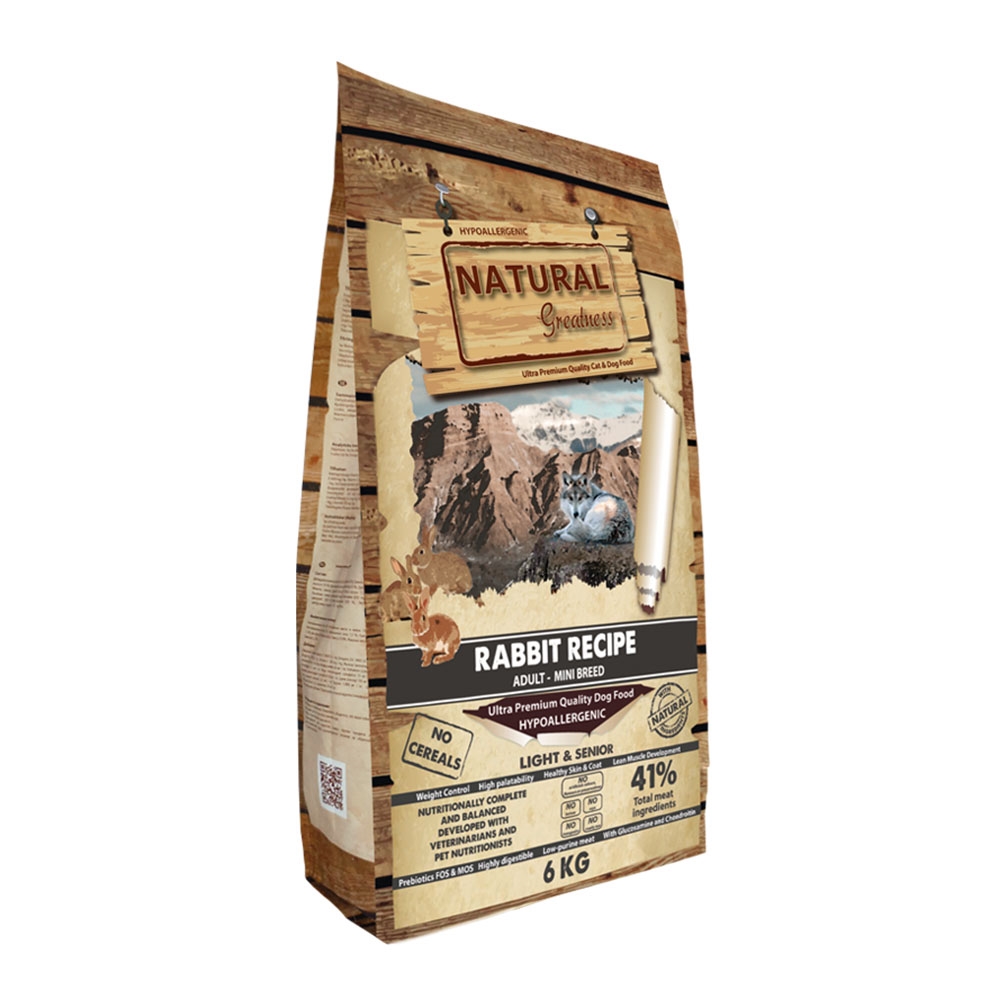 Natural Greatness RABBIT RECIPE MINI er en fremragende ultra-premium, monoprotein og hypoallergen opskrift formuleret uden korn og ideelt udviklet til voksne hunde, steriliserede voksne hunde eller seniorer af små og mellemstore racer med tendens til overvægt.