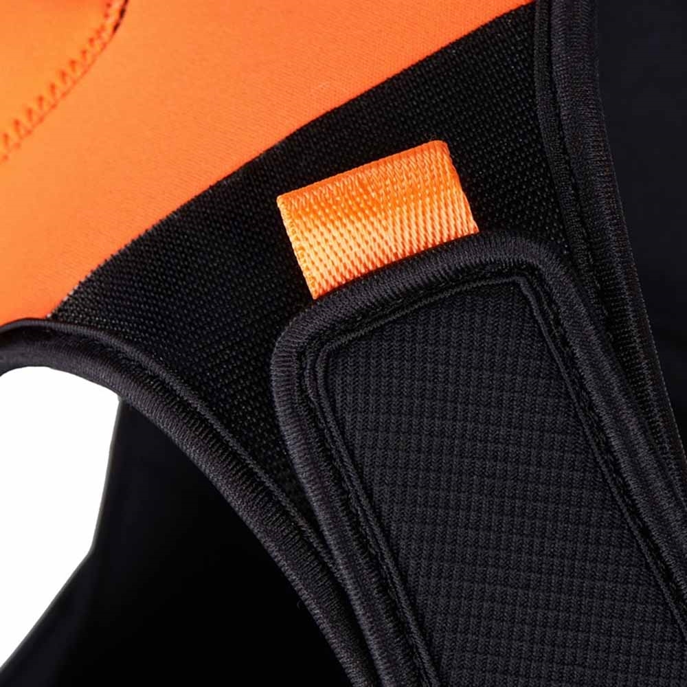 Et øvre panel dækker ryggen, skuldrene og det meste af brystet, mens et nedre panel omslutter forsiden og underbrystet. Disse forbindes sikkert med brede, kraftige velcrolukninger på begge sider af hals og bryst for en tæt, tilpasset pasform. Alle sømme og kanter er glatte for at forhindre gnaven. Skulderudskæringer bevarer fuld bevægelsesfrihed, uanset om du svømmer eller løber. Integrerede trækstropper gør det hurtigt at fjerne vesten, og alle overflader er nemme at skylle og vedligeholde.