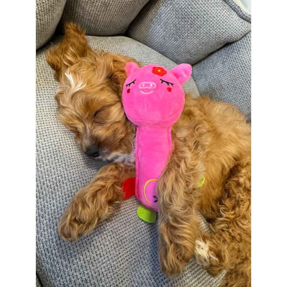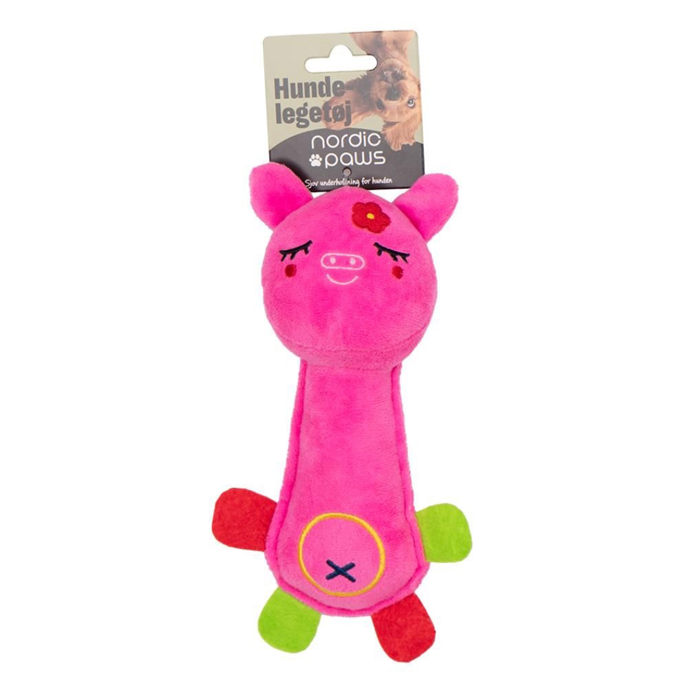 Denne søde bamse skal forestille en gris. Bamsen har en lang hals, så hundene kan få godt fat i legetøjet.