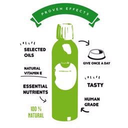 En olie til hunden der er rig på essentielle fedtsyre. Olien er med til at beskytte og give huden næring, samtidig med at den kan have en positiv virkning på pelskvaliteten. Denne olie kan være fantastisk, hvis man har en hund med tendens til tør hud. Olien er også med til at mindske pelsfældning. Denne olie er en favorit blandt hundefrisører og udstillingsfolk. Olien er velsmagende og nem til dagligt brug. Flasken skal efter åbning stå på køl og skal bruges inden for fire måneder.