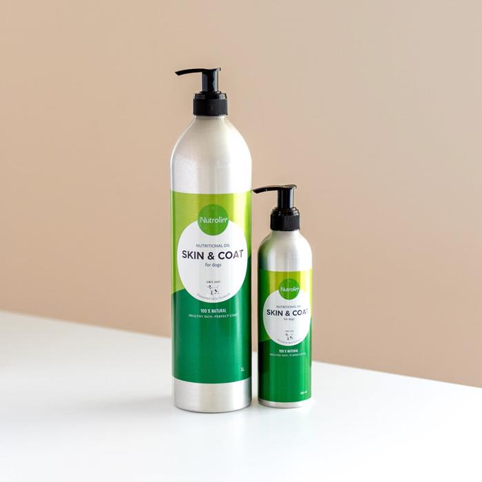 Nutrolin Skin & Coat er en lækker omegaolie, der er med til at beskytte og give næring til hundens hud og pels.