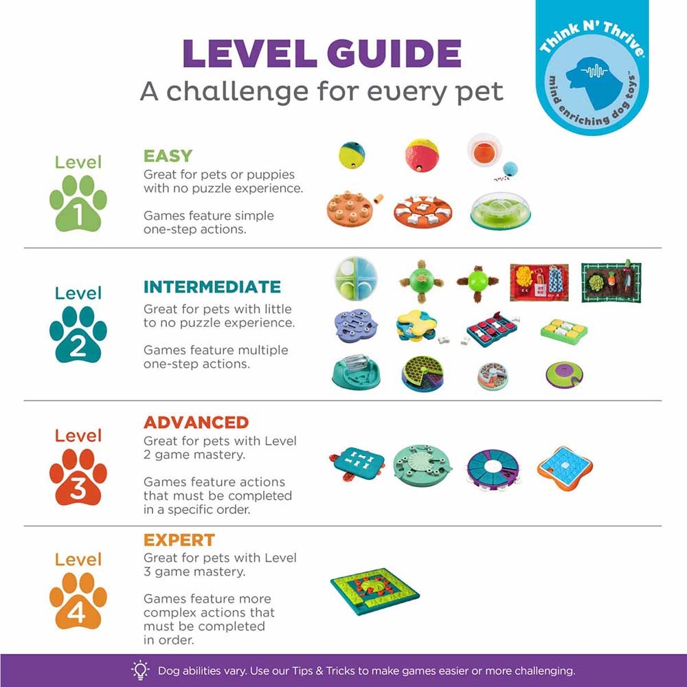 Hundelegetøjet er velegnet til alle hunde. Sværhedsgraden er på level 2 ud af 4. Nogen hunde finder lynhurtigt teknikken, andre hunde skal bruge lang tid.
