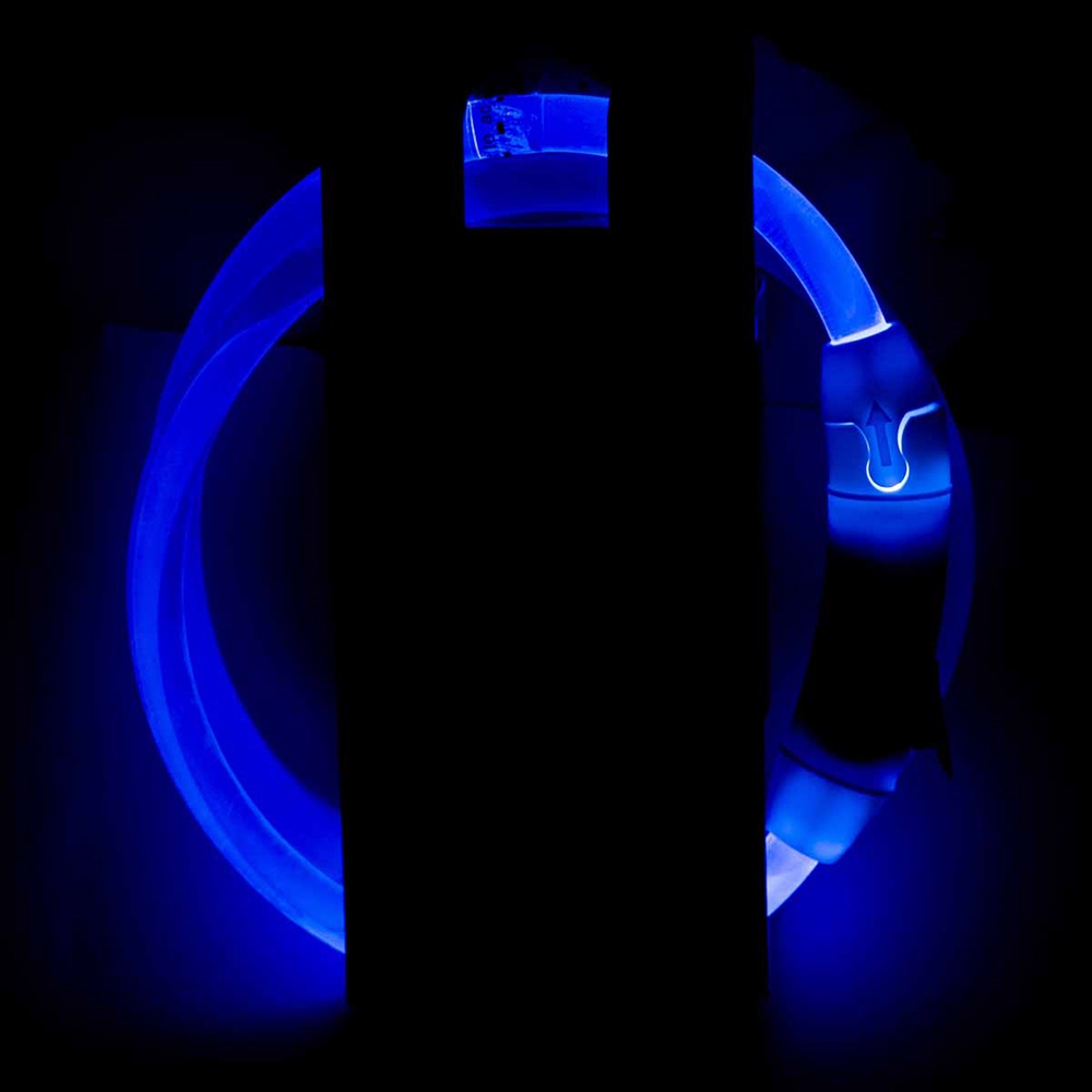 Halsbåndet er rundt og fleksibelt, og har både en pulserende farvetilstand, med skiftende lys og en konstant lysfunktion, hvor du kan vælge mellem rødt, grønt eller blåt lys - perfekt til enhver situation og hund.