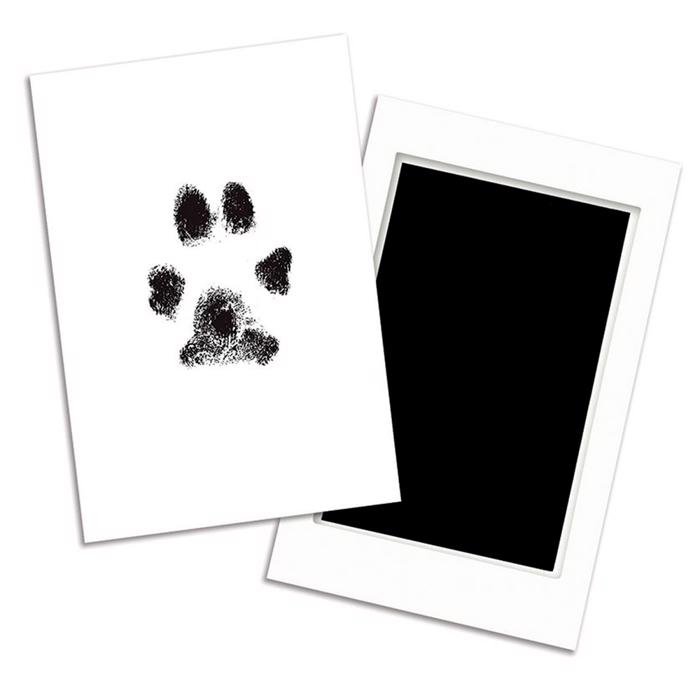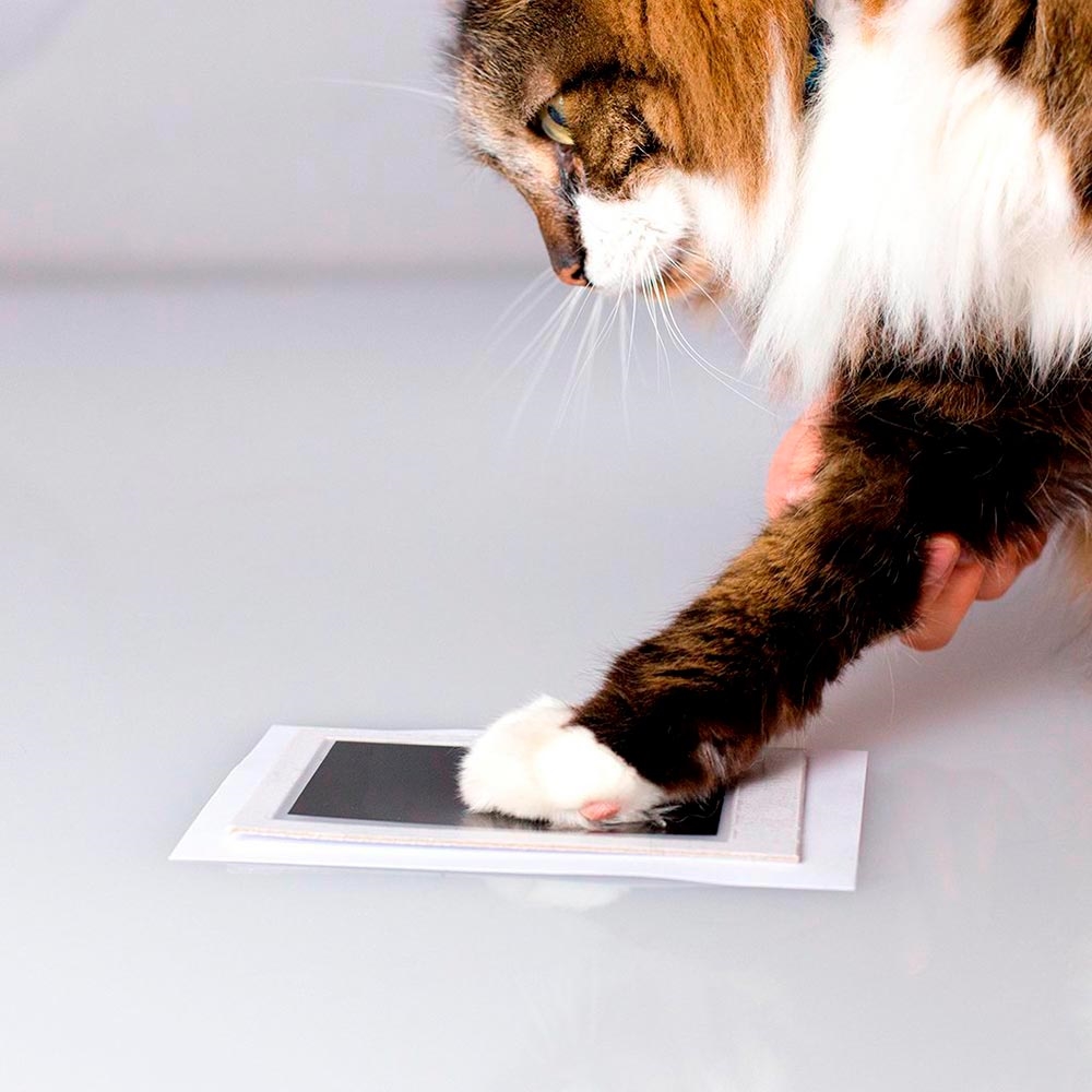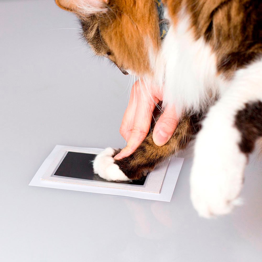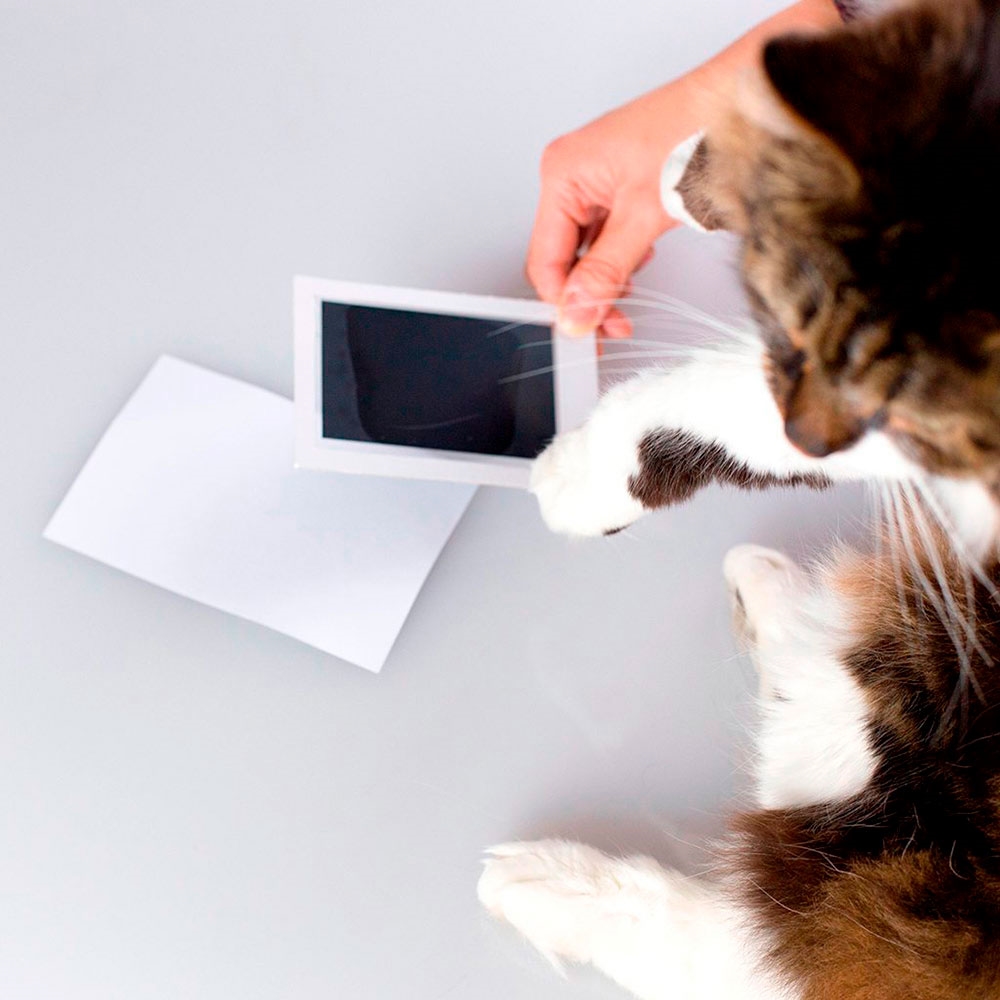 For at lave aftrykket skal du sørge for, at blækket vender nedad på det medfølgende hvide kort, og trykke dit kæledyrs pote på den rene blækpude. Dit kæledyrs lille aftryk efterlades på kortet, uden at der kommer blæk på din hund eller kat.