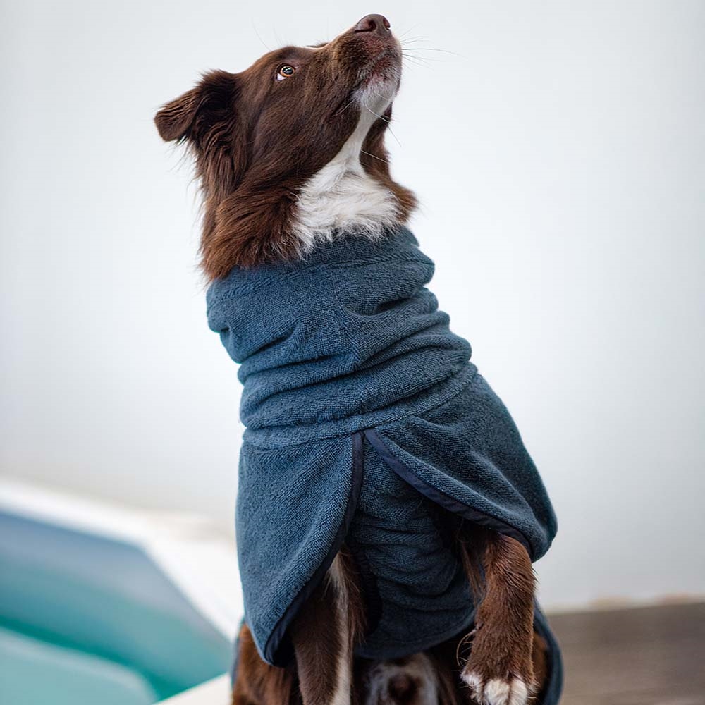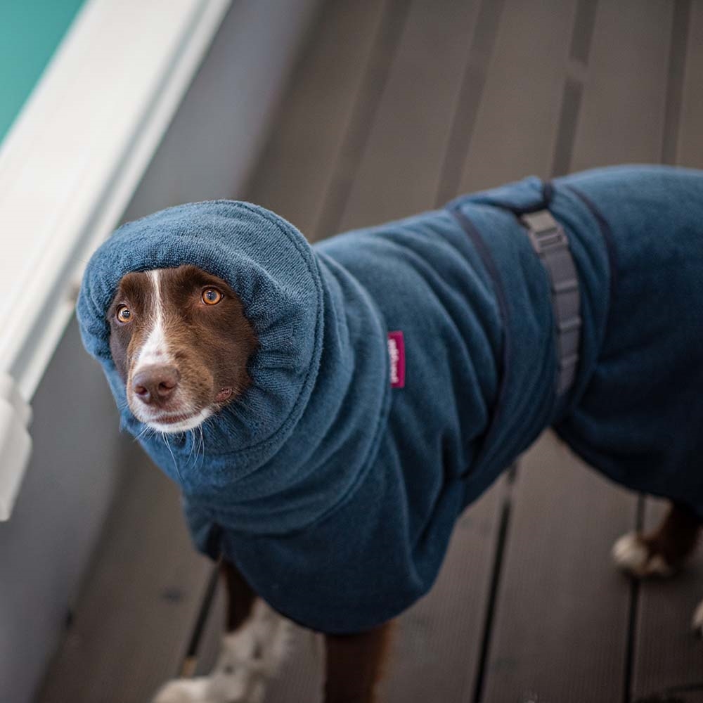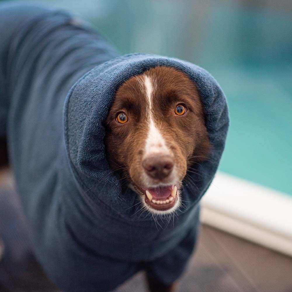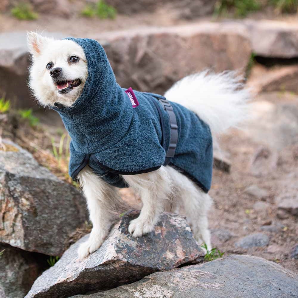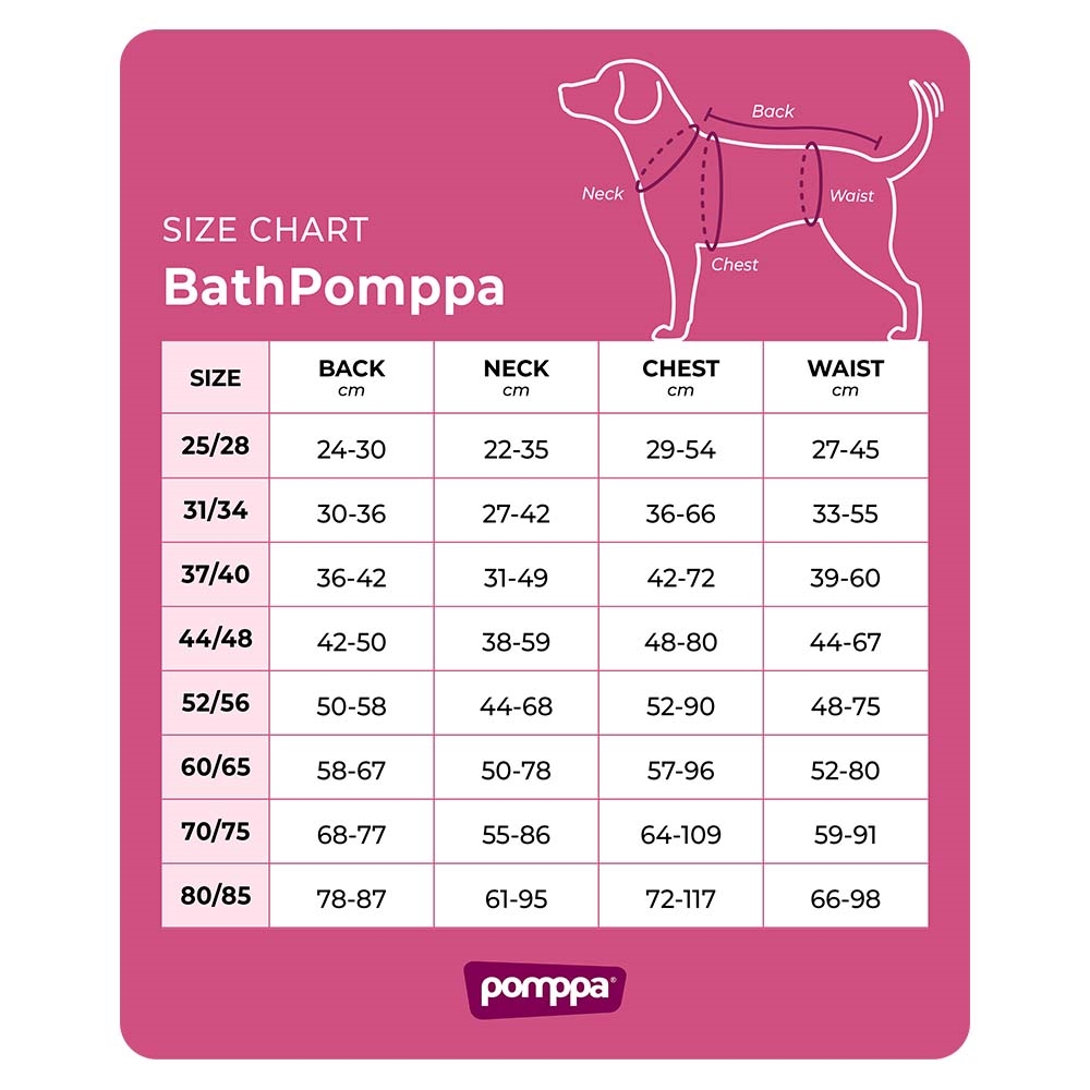 BathPomppa er en meget absorberende badekåbe, der hjælper din hund med at tørre hurtigere efter svømning, badning eller regnfulde eventyr. Den store hætte, det åndbare bomuldsstof og det uhæmmede design sikrer maksimal tørreeffektivitet og komfort for din hund.