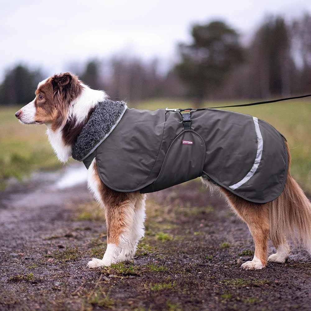ToppaPomppa er en tyk og generøs vinterfrakke til frostvejr. Det slidstærke yderstof, teddyforet og isoleringen fungerer bedst i vintervejr. ToppaPomppa er den perfekte vinterfrakke til kuldefølsomme hunde, hvorimod vi til hunde med tyk pels anbefaler at bruge den til roligere gåture eller til hvilepauser i hundesport, når det er afgørende at holde musklerne varme. SÅ varm er den nemlig!