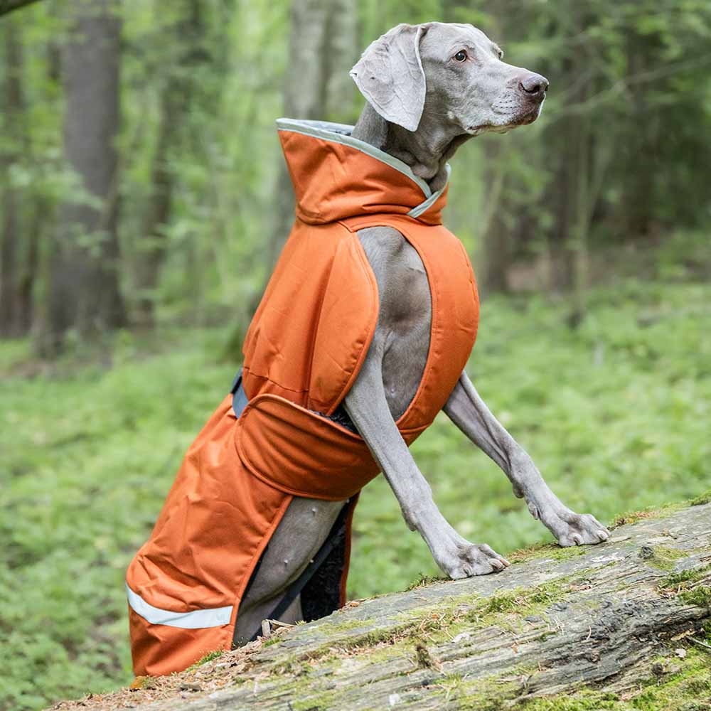 Jakken er designet med en bred reflekterende stribe bag på og rundt om hele halsstykket, så din hund kan blive lyst op i de mørke timer. Der er ingen benstropper i denne jakke.