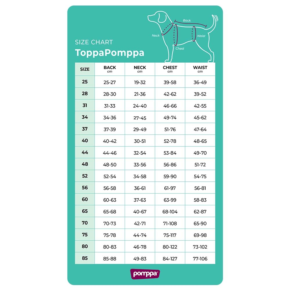 Bemærk venligst, at ToppaPomppas ryglængde er 2 cm længere end på andre Pomppa-frakker i lignende størrelser. Hvis din hund er mellem to størrelser, anbefaler vi at vælge den mindre størrelse.