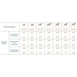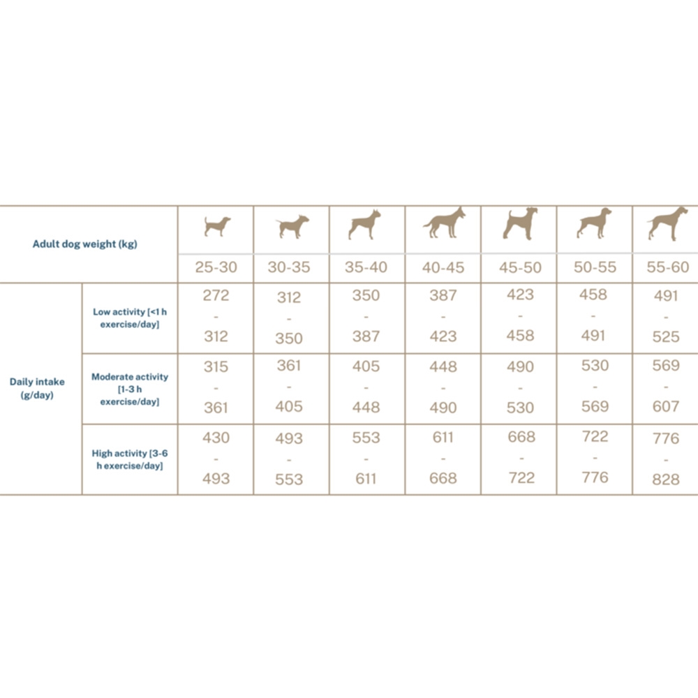 ANALYTISKE BESTANDDELE: Råprotein 27 % – Råfedt 15 % – Råaske 8,1 % – Råfibre 3,2 % – Calcium 1,7 % – Fosfor 1,1 % – Kalium 0,7 % – Natrium 0,2 % – Omega-3 0,78 % – Omega-6 3,49 %.