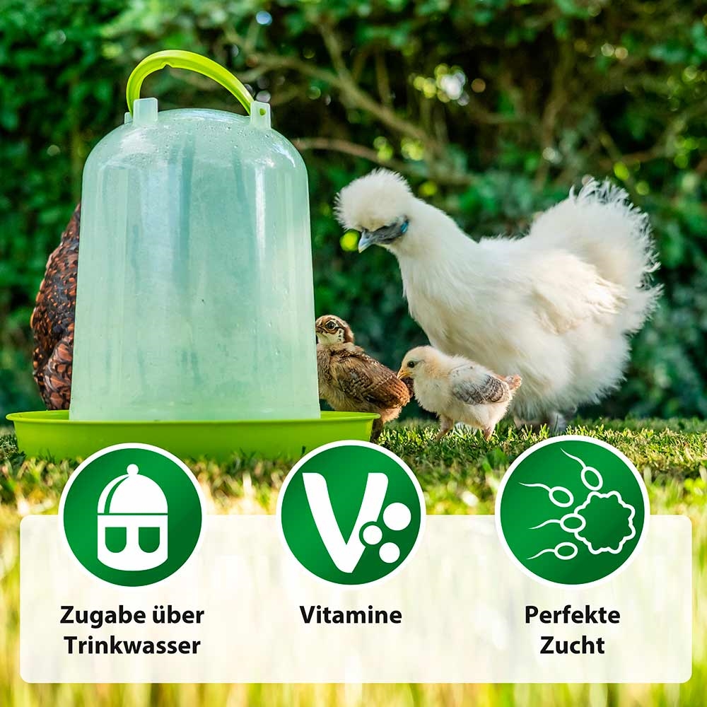 Tilskudsfoder til fjerkræ og duer. Vitamin A, D, E og C i flydende form. Flasken indeholder 250 ml.