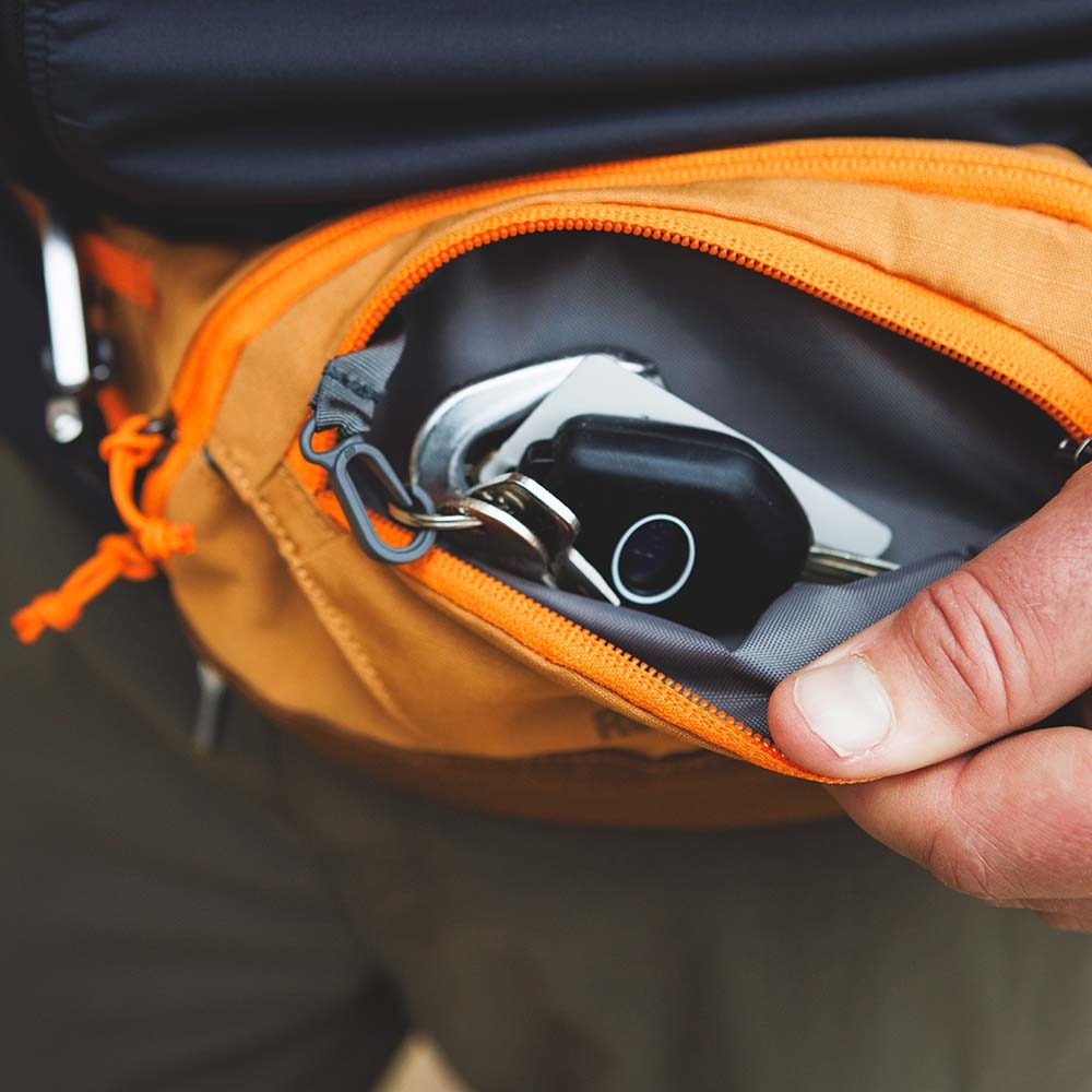Ruffwear Home Trail Hip Pack er den lille bæltetaske til gåturen. I stedet for at du har dine jakkelommer fulde af hømhøm poser, nøgler, krummer fra gamle godbidder og alt muligt andet, så kan du nu samle alt hundens udstyr i én taske.
