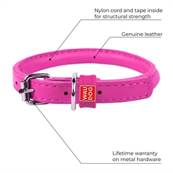 Køb et rundsyet halsbånd i læder til din hund. Det er lavet i lækker læder - og det hjælper med til at "beskytte" din hunds pels.