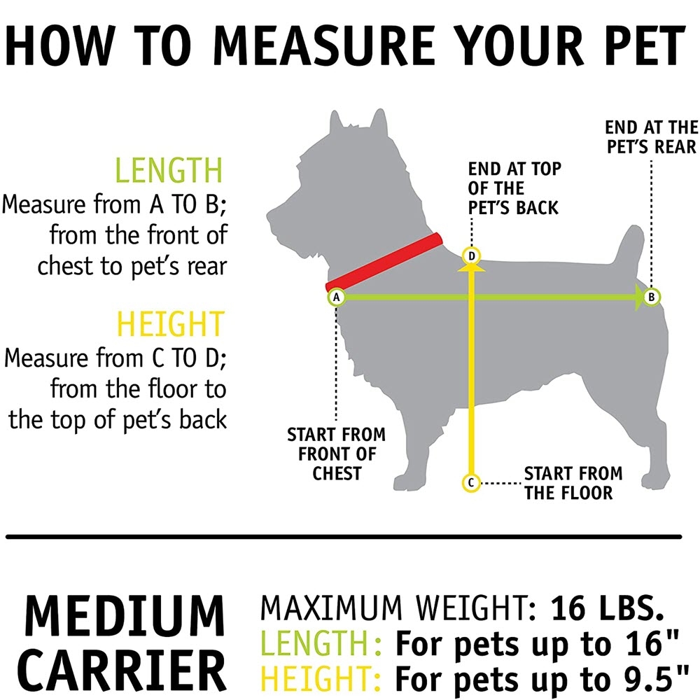 MEDIUM måler Længde 43,1 cm x Bredde 27,9 cm x Højde 26,6 cm (taskens egenvægten er 1,9 kg) Egnet til hunde der måler i højden (fra fod til nakken) 25,4 cm og en vægt op til 7,25 kg