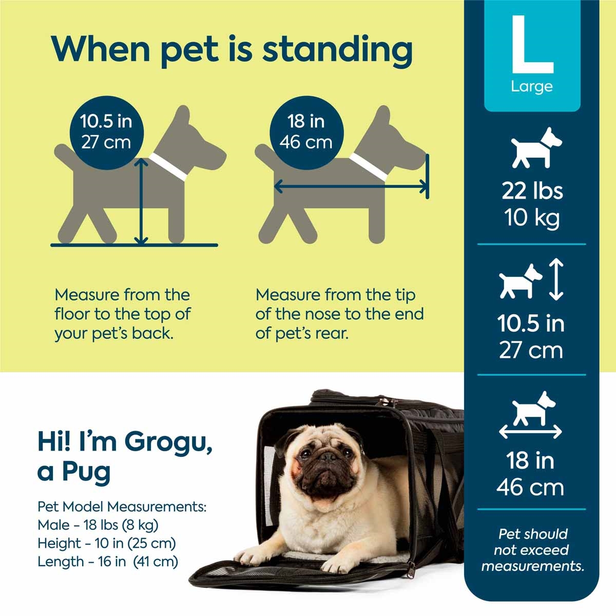 LARGE måler Længde 48,2 cm x Bredde 29,8 cm x Højde 29,2 cm (taskens egenvægten er 2,13 kg) Egnet til hunde der måler i højden (fra fod til nakken) 27,9 cm og en vægt op til 9,97 kg